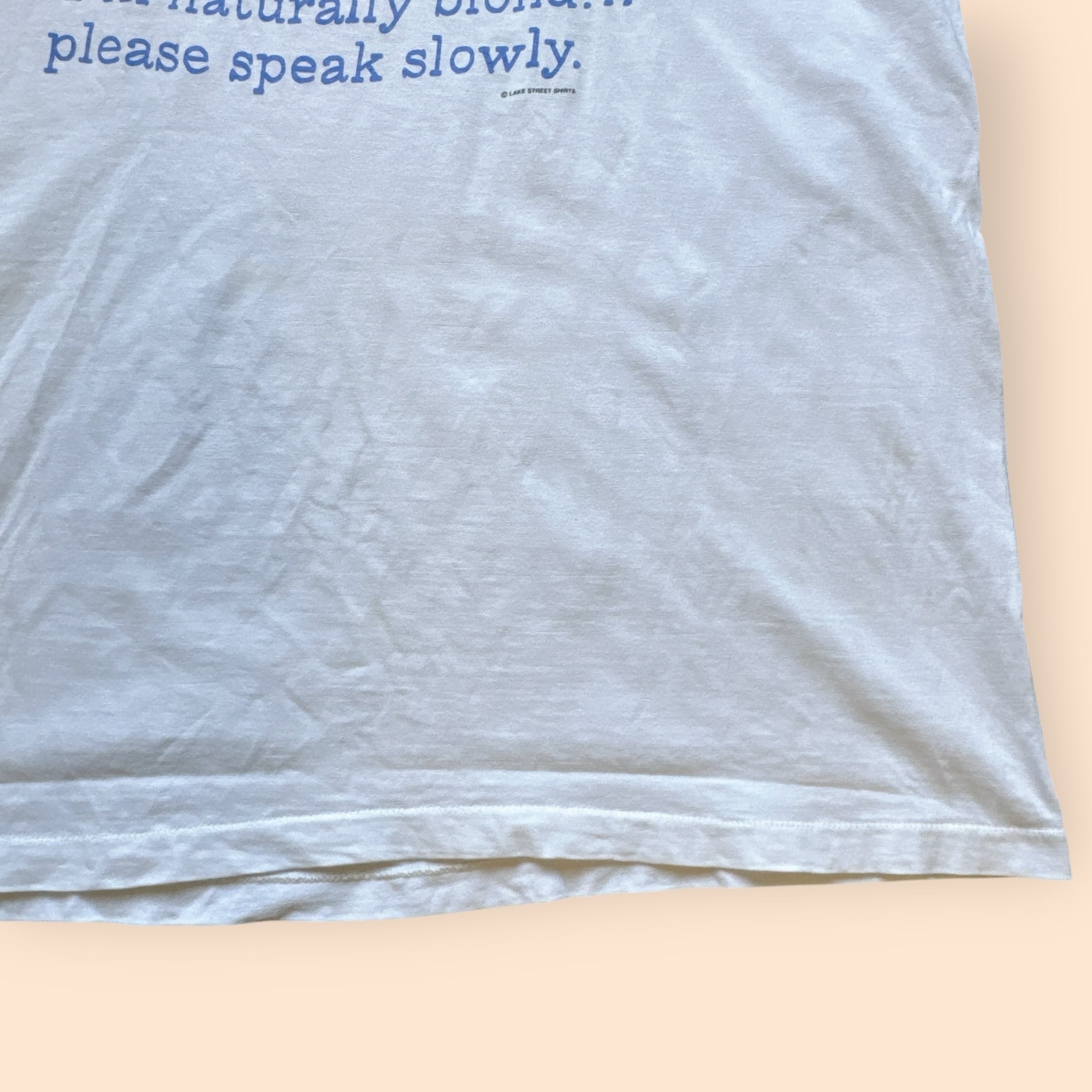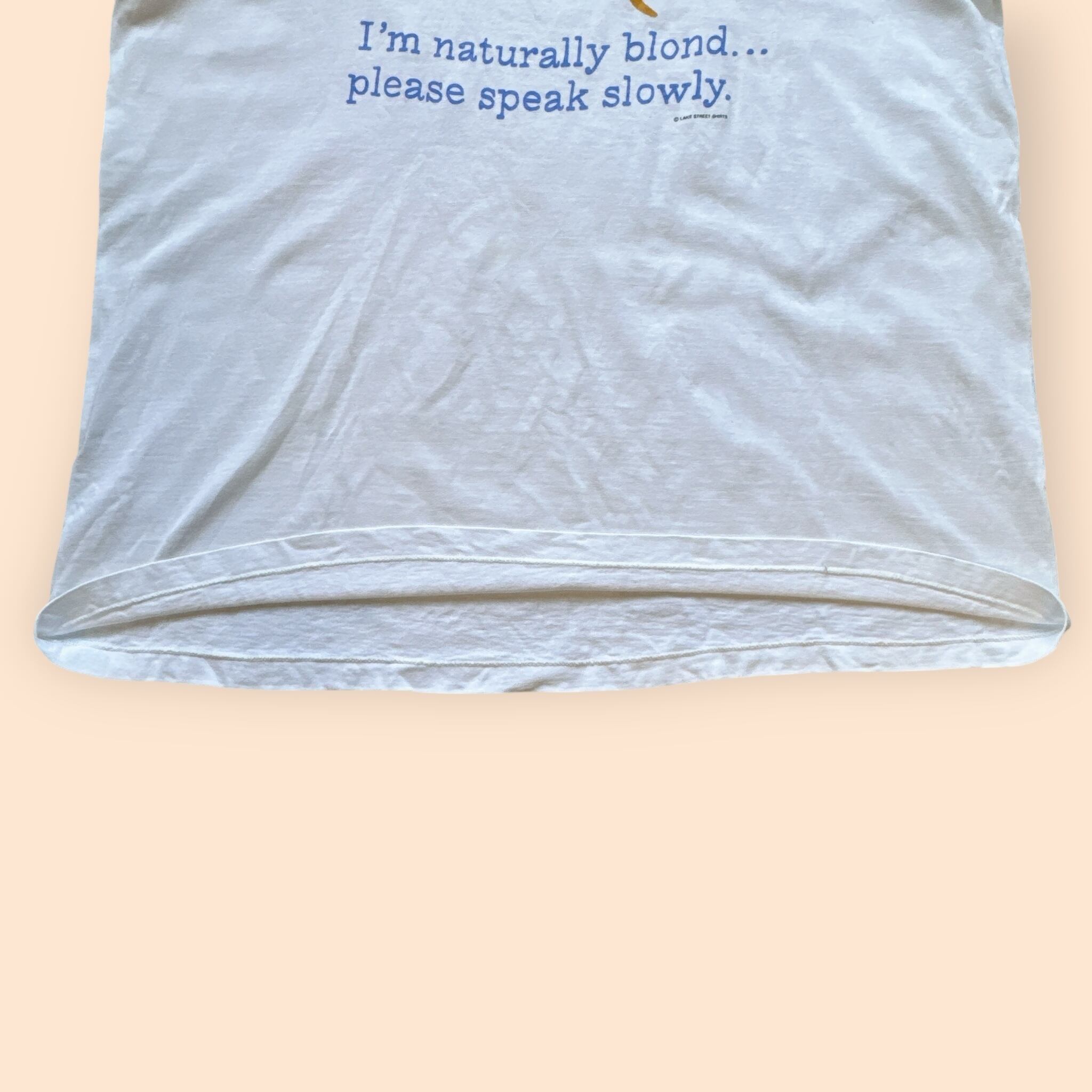 フロント中央にイラスト、その下には、"私は生まれつきの金髪です、ゆっくり話してください。"という意味の英語がプリントされています。