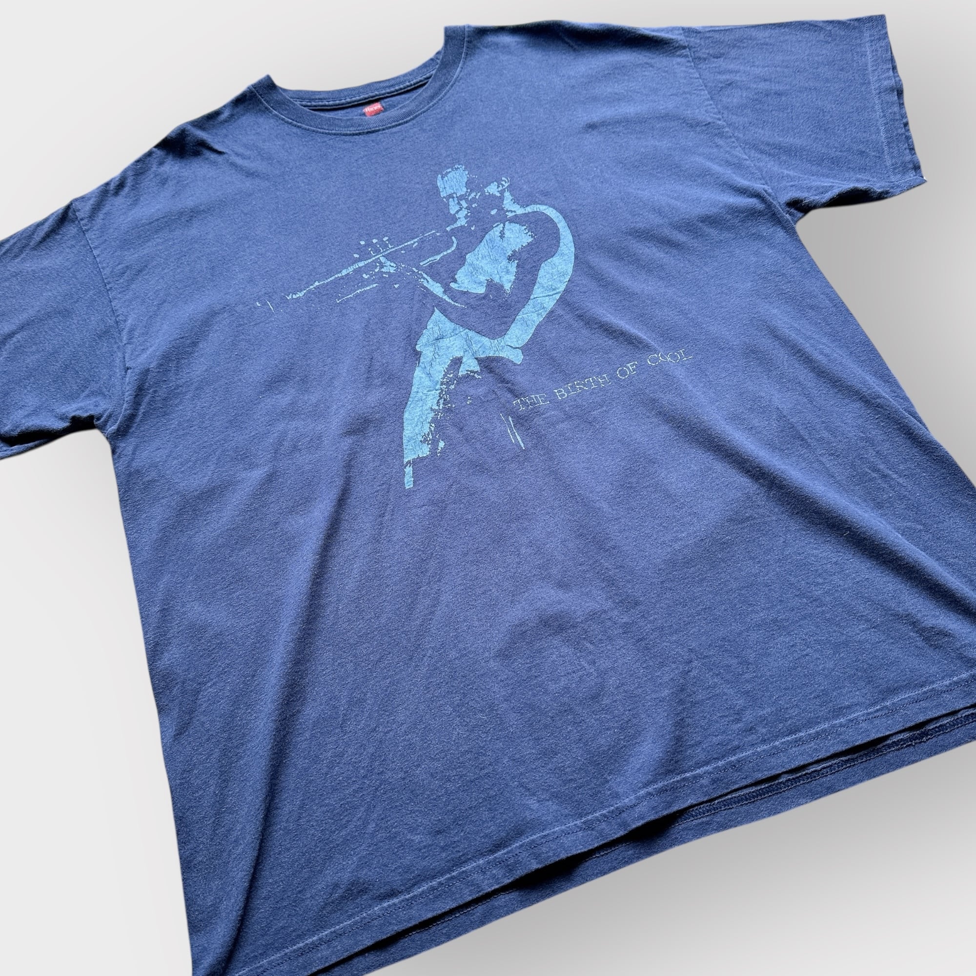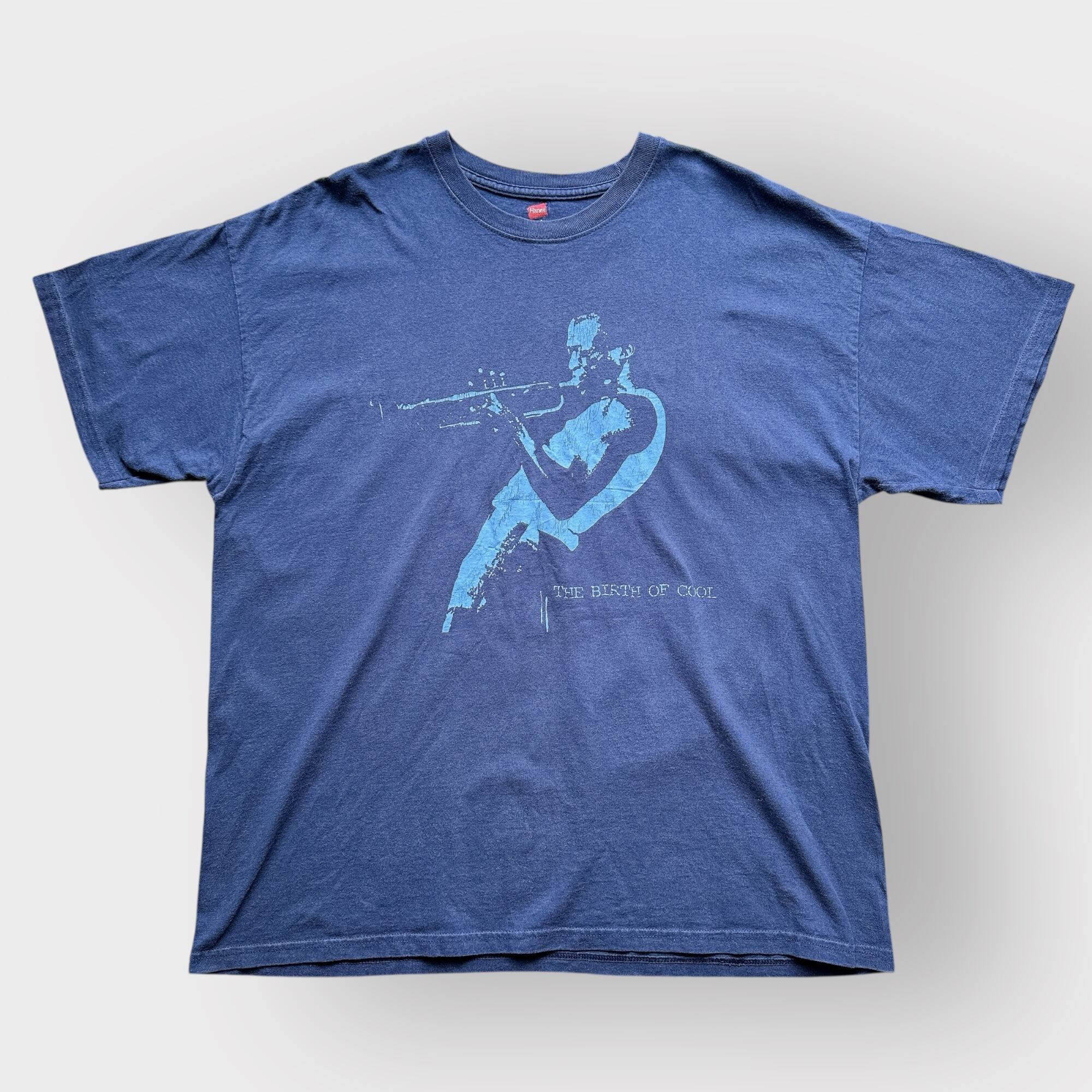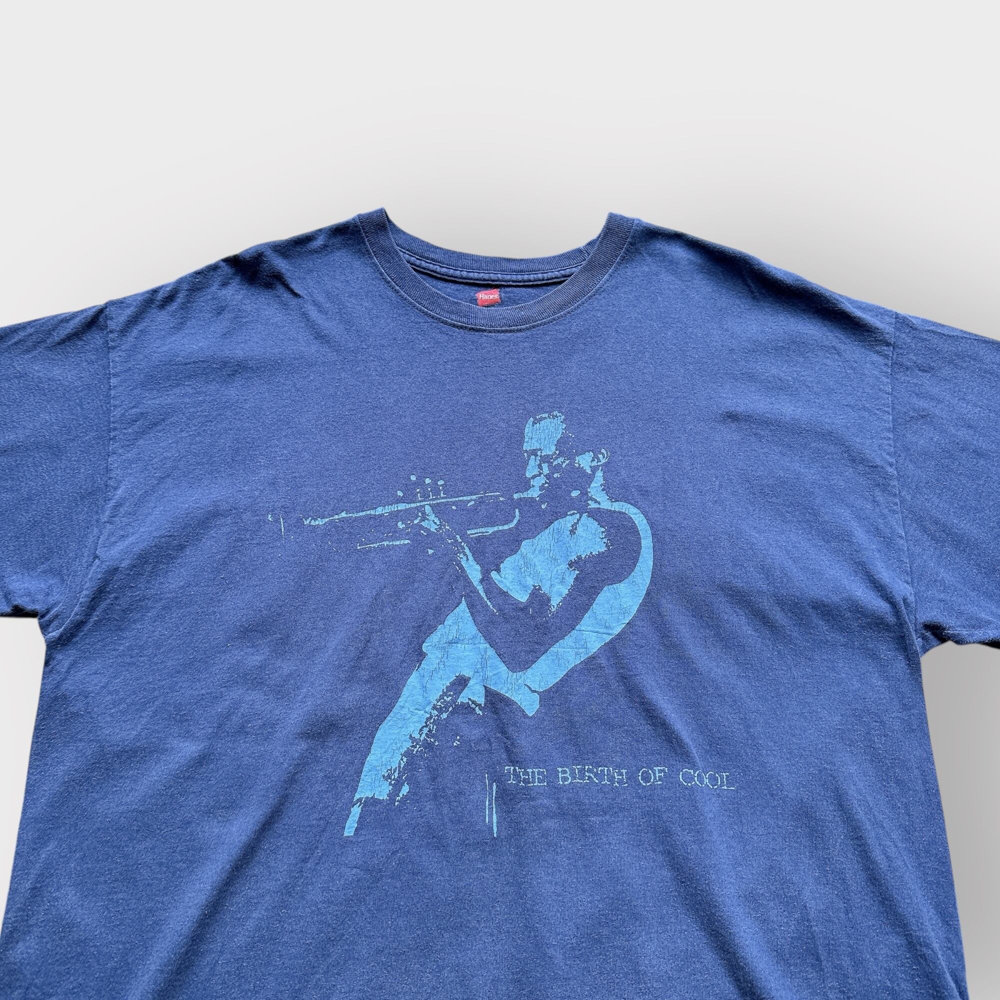 このTシャツはネイビーボディのフロントに、マイルス・デイヴィスの有名なグラフィックとTHE BIRTH OF COOLの文字。