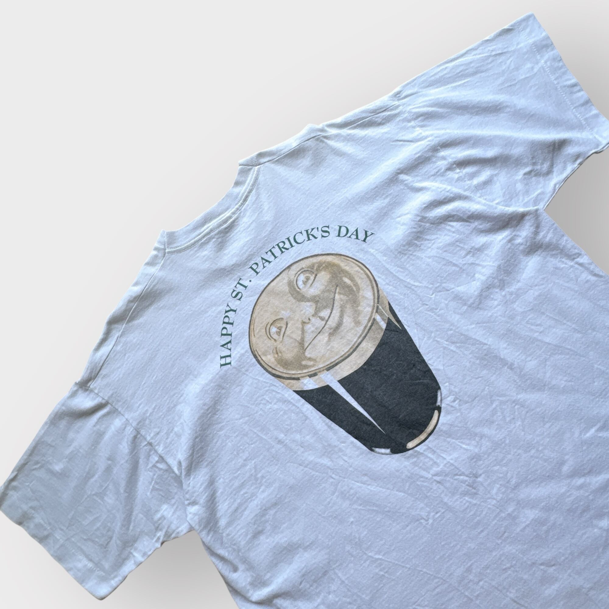 このTシャツは両面プリントデザインで、フロント胸元にはロゴプリント、バックにはセントパトリックデーというアイルランドの祝日を祝うコミカルなデザイン。
