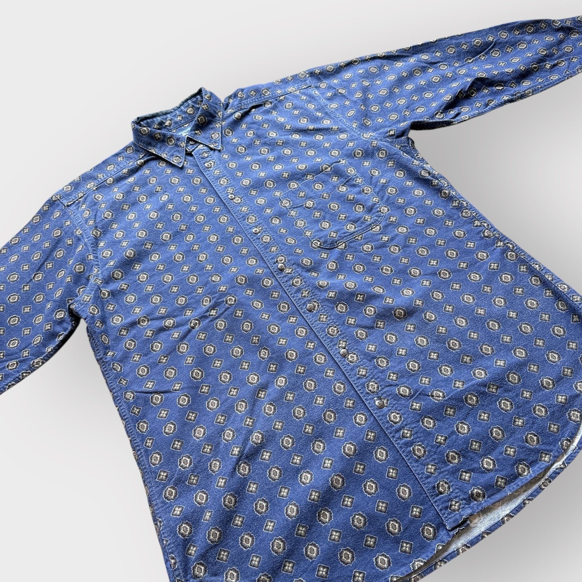 ネイビーボディの総柄、ボタンダウン、左胸にポケットの付いたディテール。
